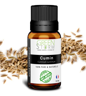 Nom botanique : Cuminum cymimum Partie de la plante utilisée :graine Origine : Egypte Chémotype & chromatographie type: Aldhéhyde Cuminique, Gamma terpinène, beta pinène, para cymène Couleur : jaune clair- orangé Odeur: Chaude, puissante et épicée Culture :agriculture conventionnelle Méthode d'extraction :distillation totale et complète à la vapeur d'eau (notre huile essentielle contient la totalité des principes aromatiques de la plante), extraite sans solvant, non déterpénée