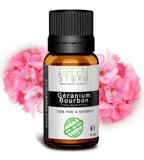 On constate alors que le parfum de son huile essentielle est plus intense, légèrement mentholé et sucré : c'est le géranium bourbon. L'huile essentielle de géranium bourbon est produite par la distillation à la vapeur des fleurs et feuilles fraîches de géranium bourbon.